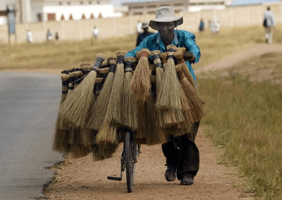 A Zimbabwean broom vender pushes his bike on the streets of Chitungwiza outside Harare. ALEXANDER JOE/AFP via Getty Images