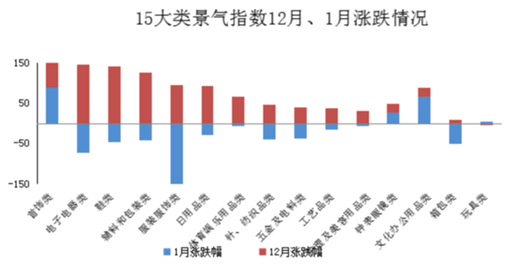 如图所示,首饰类贸易于2021年1月和2022年1月稳定地复苏,而箱包业,则是从增长的趋势转为了景气指数的跌落。