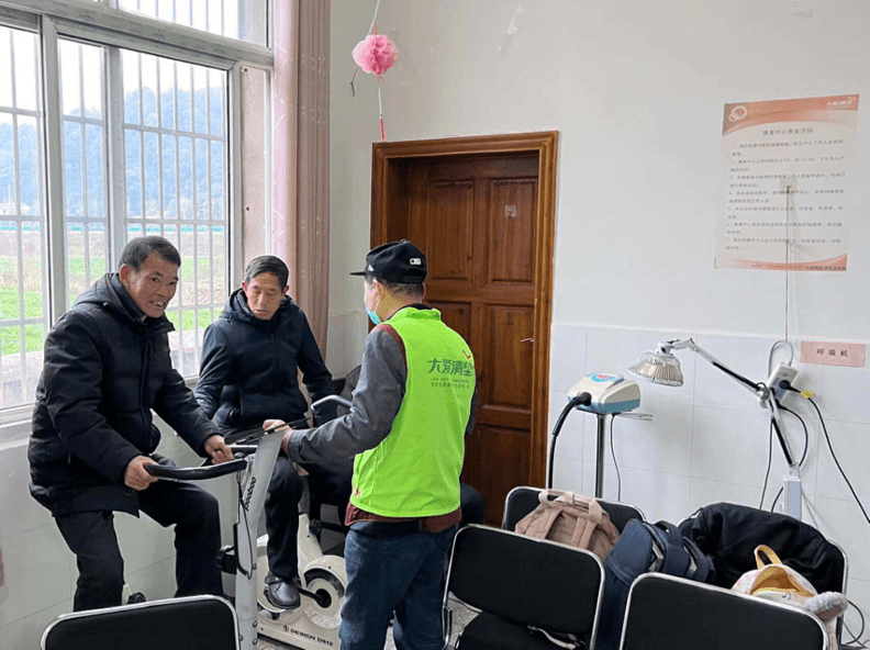 康复中心依托各乡镇的卫生院建立,有专门的医生、护士与志愿者为尘肺农民们提供免费服务,监测患者的身体状况,并带领他们进行康复运动。