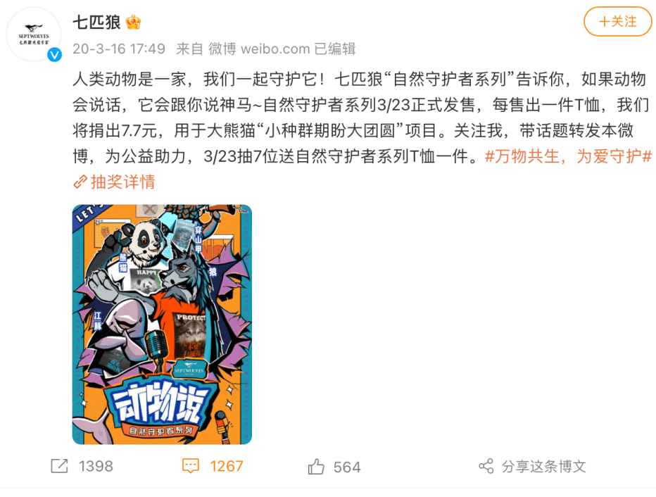 2021年9月,七匹狼男装又与联合国际知名品牌御用设计师团队Fasano Studio,推出“做TA的守护者”系列动物保护主题联名茄克。这个系列将狼、虎、豹、熊猫等珍稀动物的图案融入到七匹狼的夹克和卫衣上,向公众传递动物保护理念。