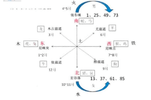 图中应为是一个类人的生物,其头向东,尾向西,两肋骨分别代表北和南。其手臂指向的是东北和东南方向;两腿分别指向西北与西南。同时,每一方位所对应的地支和五行都标注在图中。达巴利用该图,能推测占卜孩子的属性和一生。孩子出生在摩梭村落中的哪个方位,达巴就按照此图来算出孩子的属性,并得知其相生相克的属性。从孩子一岁开始,男孩从东方开始顺时针计算,女孩从西方开始逆时针计算。占卜图上有8个方位,而计算周期为12年,因此年龄与方位则如示意图所标明。一名摩梭人具体年龄所在的具体方位则是其适宜的吉位。达巴可通过该年地支以及达巴的天干与元素进行计算,从而得知吉凶。月份也是如,以12月为一周期,从年计算相同的位置开始,从而得知孩子的相生相克属性,与其相应的星宿与神灵。以下图表显示了相对应的关系:
