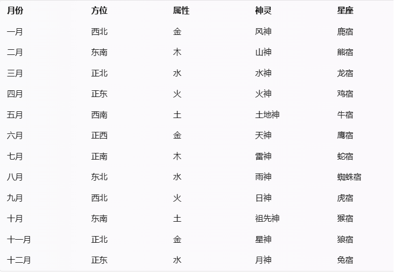 与正北相对的是水神,水属性,掌管江河湖泊中的鱼虾水草等,是摩梭人的生命神,也是摩梭人的治病神。水神的星宿是龙宿,由御夫座中的几颗恒星组成。