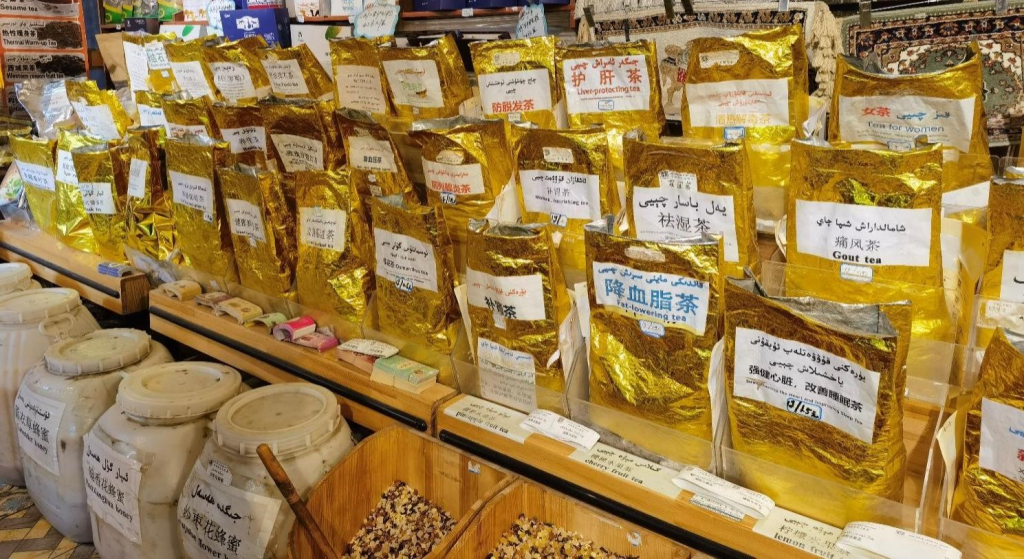 在喀什古城帽子巴扎有一家百年老字号药茶店,年轻的店主阿布都艾尼是药茶店的第五代传人。药茶是维吾尔族特有的传统保健茶,以小豆蔻、沙枣、肉豆蔻、肉桂、丁香等天然植物加工精制而成,具有健脾胃、消食、驱风、散寒等功效,再加上其味道独特,颇受当地人及游客的喜爱。