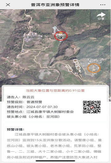 监象员的主要任务是确保大象位置的预警信息能快速准确地传达给每个村民。村里创建了村民微信群,监象员在群里每天会定期通过“普洱市亚洲象预警小程序”更新追踪象群位置的信息。预警小程序”详细记录了象群的数量、出现地点及行进方向,使村民能及时了解到象群可能出现的位置,避免可能发生的冲突。