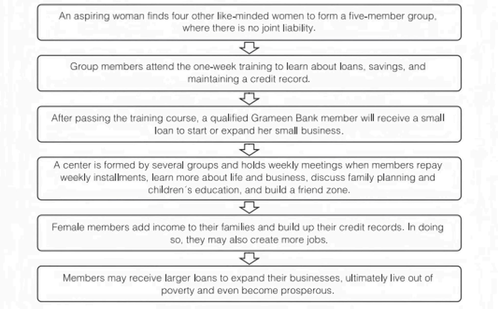 Firstly, in the Grameen model, forming mutual aid groups and receiving economic assistance is both necessary and beneficial. As shown in the graph, the five-member group is the basic unit for obtaining a loan. These groups ensure sustainability through mutual trust among their members. By adhering to a structured repayment and saving schedule, members may develop a long-term perspective on financial management. Strong bonds within the groups encourage members to supervise and support each other, ensuring timely repayments. This system of mutual accountability fosters financial discipline and enhances the overall effectiveness of the loans.