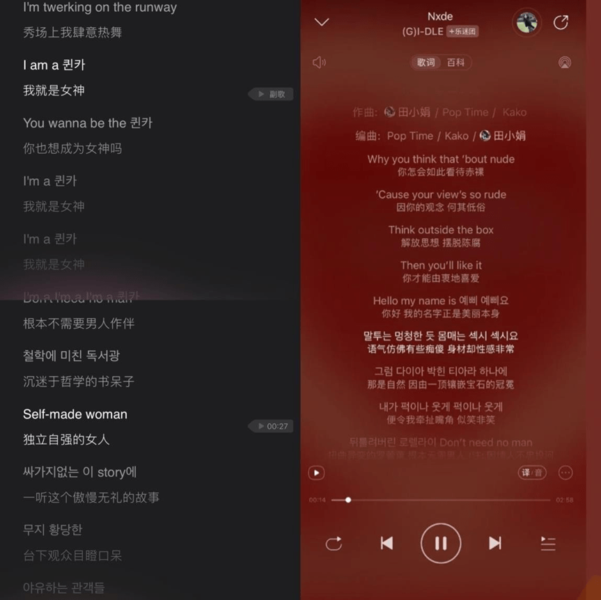 近些年来,韩流女子偶像团体所发行的歌曲似乎开始觉醒,从歌词中直白地表达着我是女王,我生来赤裸,肮脏的人是你等充满女性力量的概念,近代女团 G IDLE 就正在做这样的事。